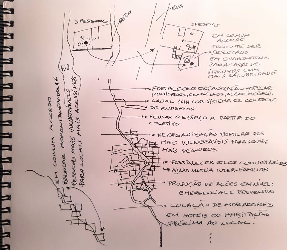 1- Fortalecer a organização popular pelas instâncias existentes nos territórios, colocando como pauta primordial a segurança de saúde diante da pandemia, isto é: buscar em todas as comissões, comitês, coletivos, associações de moradores, grupos organizados destes territórios elaborarem em rede a pauta comum de elucidação prevenção e articulação de ações conexas a garantia da salubridade. Ter uma espécie de comitê de contingenciamento ou rede que seja do lugar e que articule 24h a relação com os sistemas de controle de endemias do estado e a população do lugar.