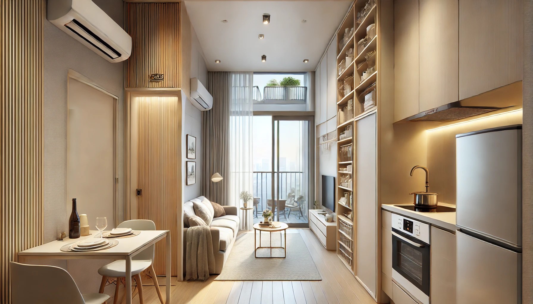 Imagem meramente ilustrativa, gerada por AI -DALL-E tendo como referencia um apartamento studio de 22m² e pé direito de 3,20m.